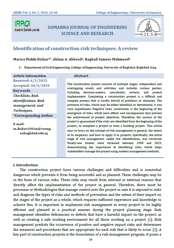 - [72] M. M. Dishar, M. R. Altaie, and A. A. Abbood, "A Review Study to Extract the Reasons Leading to Cost Increase in Construction Projects: A Review Study to Extract the Reasons Leading to Cost Increase in Construction Projects," Samarra Journal of Engineering Science and Research, vol. 2, no. 3, pp. 187-206, 2024.